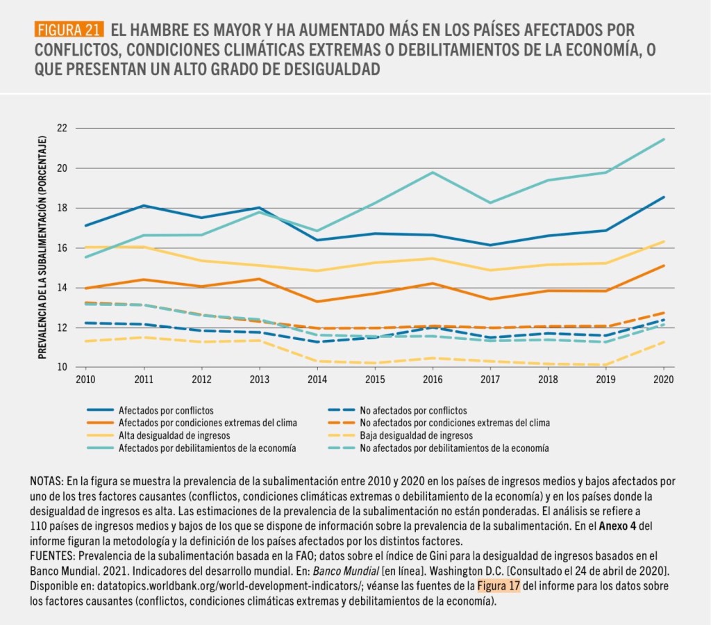 20. No Entanto o último estudo da FAO El estado de la seguridad alimentária y la nutrición en el mundo 2021, além de constatar o óbvio, que os conflitos, problemas climáticos e economia em crise, originam fome, reconhece também, que os países com baixa desigualdade social tem menos fomes do que, os com alta desigualdade, o que é o nosso caso, vejamos os dados globais: