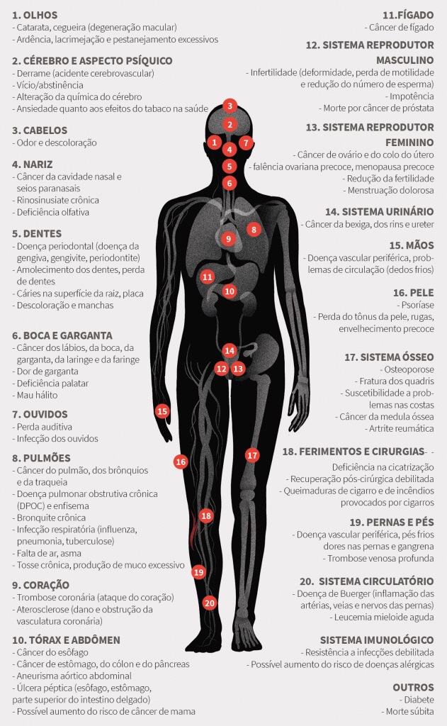 28. Apenas nas últimas décadas, estudos demonstraram o tremendo dano à saúde humana. causado pelo tabagismo. A OMS (Organização Mundial de Saúde), estima que 8 milhões de pessoas morrem anualmente, pelo uso da nicotina, destas, 1,2 milhões são fumantes passivos. Infarto, AVC, fibrose pulmonar câncer (na boca, laringe, pulmão), deformação de fetos, etc.., são os efeitos mais conhecidos.