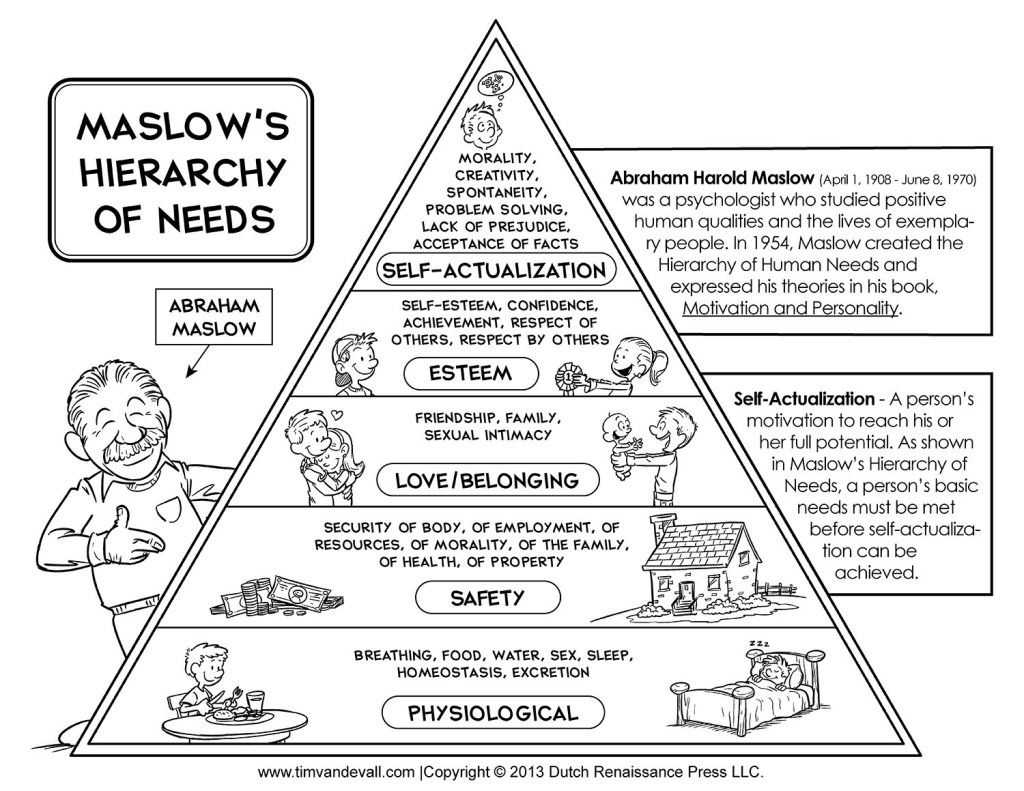 10. Sua escala, em cinco níveis, iniciava com as necessidades fisiológicas (alimentação, respirar, descansar, dormir), as básicas para manter a vida; O nível seguinte seria a necessidade de segurança, se referindo a segurança corporal, física, relacionada com a proteção dada pela moradia; O terceiro nível, refere-se as necessidades sociais, das relações familiares, de amizade; O quarto nível a necessidade de estima, de auto-estima, de reconhecimento social, de ser respeitado; E o último nível da escala criada por Maslow é a de auto-realização ou seja, quando estando satisfeitas as necessidades das hierarquias anteriores, o indivíduo se sente realizado.