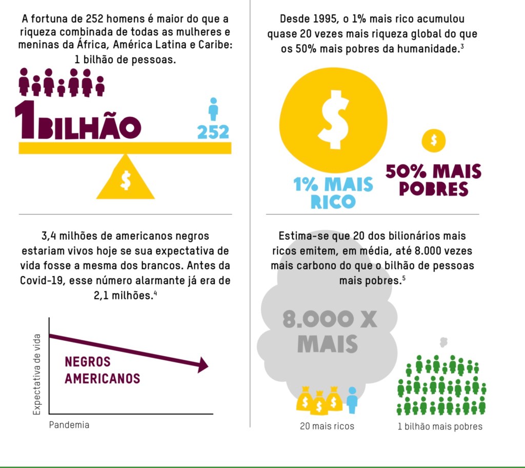 38. O recente relatório da OXFAM As desigualdades matam”, denunciando a falha mundial dos governos em distribuir equitativamente as vacinas na pandemia, se concentrou em desmascarar a inesperada e imoral concentração de renda ocorrida neste período de tragédias coletivas. Nunca no mundo, em tão pouco tempo e com tamanha catástrofe epidemiológica, com tal rapidez de contágio e número de mortos, haviam se registrado tanta concentração de fortunas em poucas mãos. Esta, é uma leitura importante para todos. Aqui, ousamos usar alguns dados da mesma: