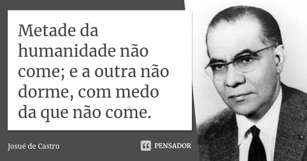 11. Contribuindo com os estudos e a denúncia da realidade planetária sobre a fome, Josué de Castro, com a Geografia da Fome (1946), foi uma primeira contribuição de grande impacto, desnudando desde o Brasil uma realidade de vários continentes, a morte pela fome. Problema de base em qualquer estudo sobre desigualdades e, que ninguém ousa refutar. Ver neste blog, o ensaio A FOME…NÃO ACABA.