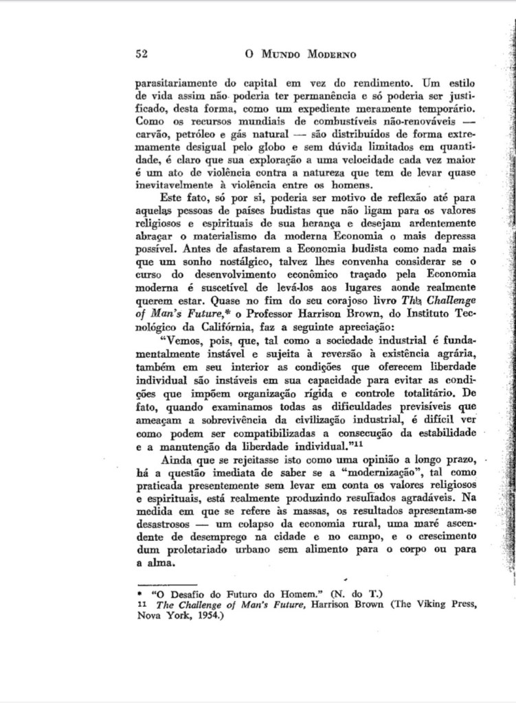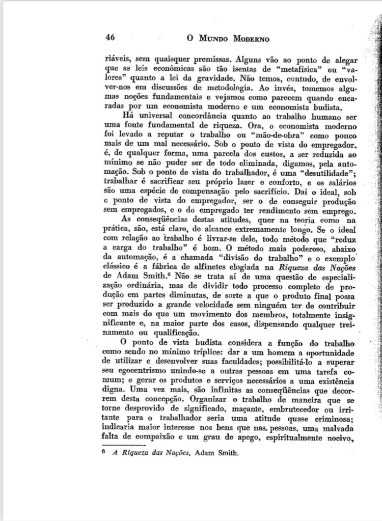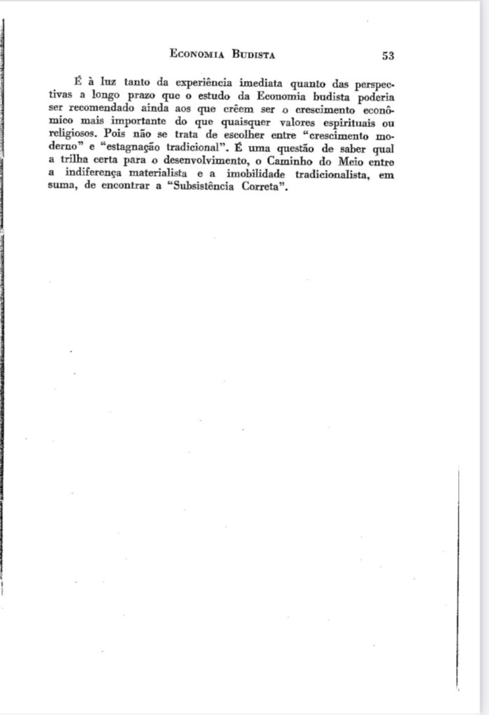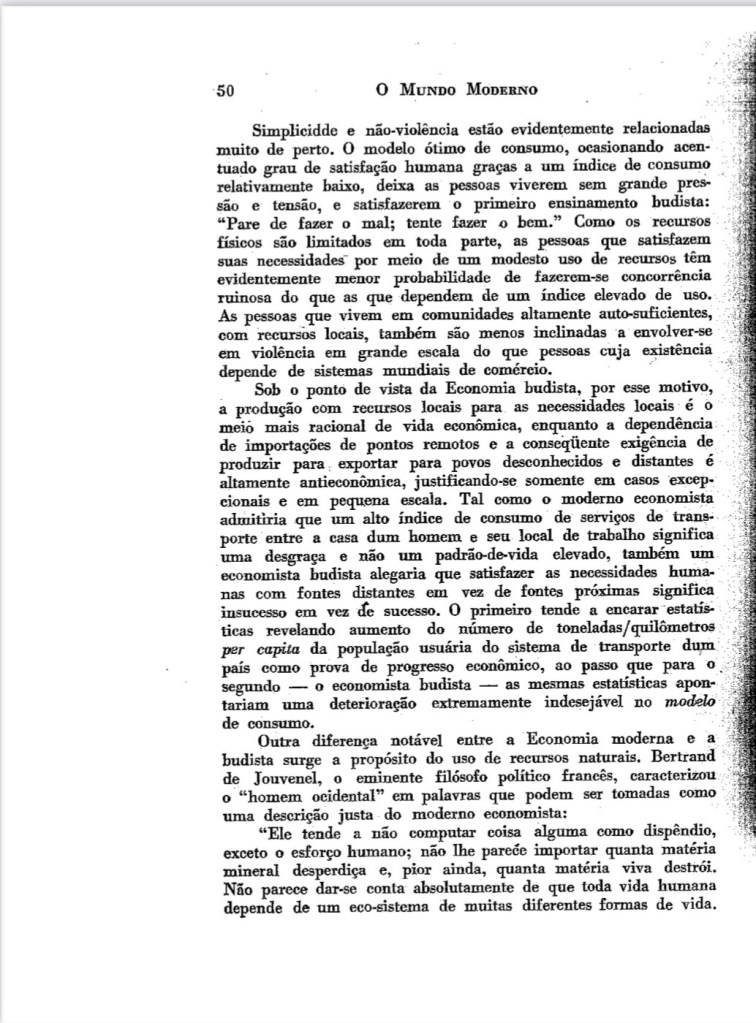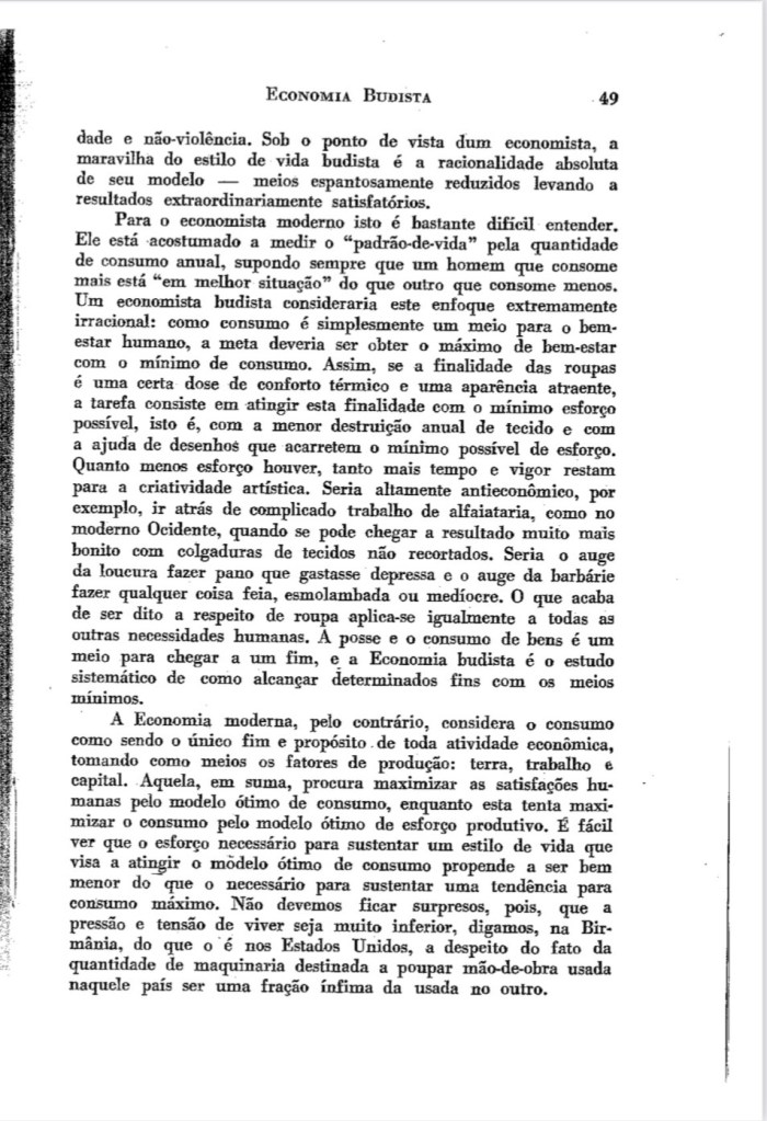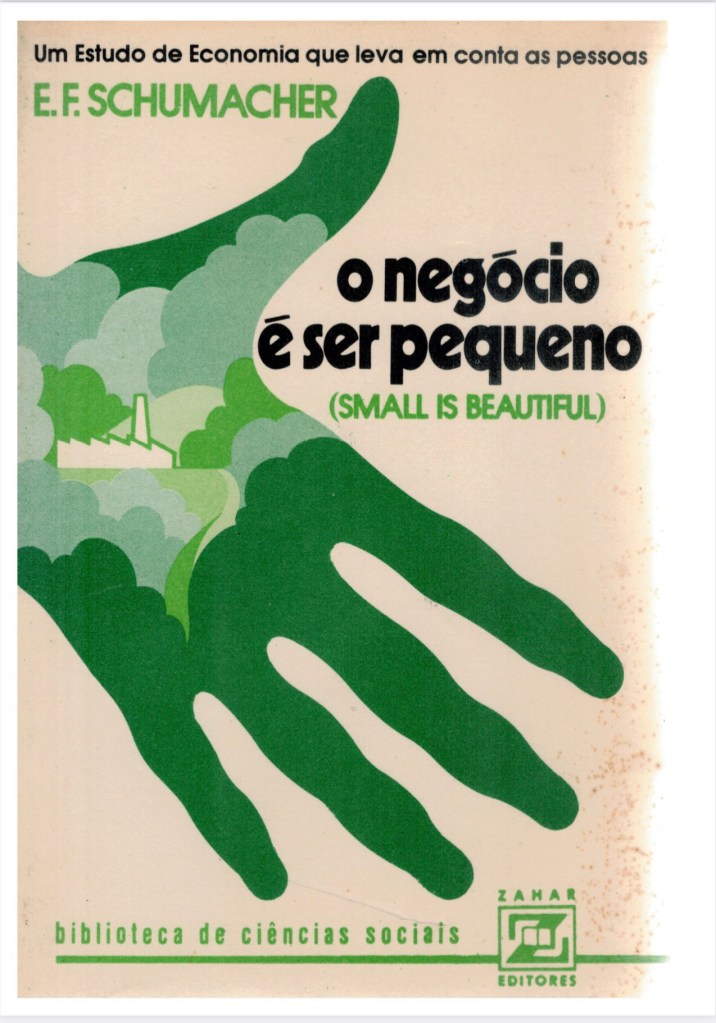 Para os menos colonizados, nestes momentos em que as desigualdades aumentam, a violência se impõem e, a “questão” climática assusta, é bom recordar como este capítulo de E.F Schumacher , tem inquietudes atuais. Ele se antecipa com a atual explosão de novidades, como as teorias andinas do desenvolvimento do Buen vivir (Sumak Kawsay em Kichwa ou, Suma Qamaña em aymara), e também, como ensaístas vigorosos, como a Kate Rowarth (Economia Donutz), o Thomás Piketty (Capital e Ideologia), o Serge Latouche (Pequeno Tratado Sobre o Decrescimento Sereno), Ha-joon Chang (Chutando a Escada), o Joaquim Sempere (Mejor con Menos). Tomo a liberdade, de recomendar a leitura deste pequeno clássico.